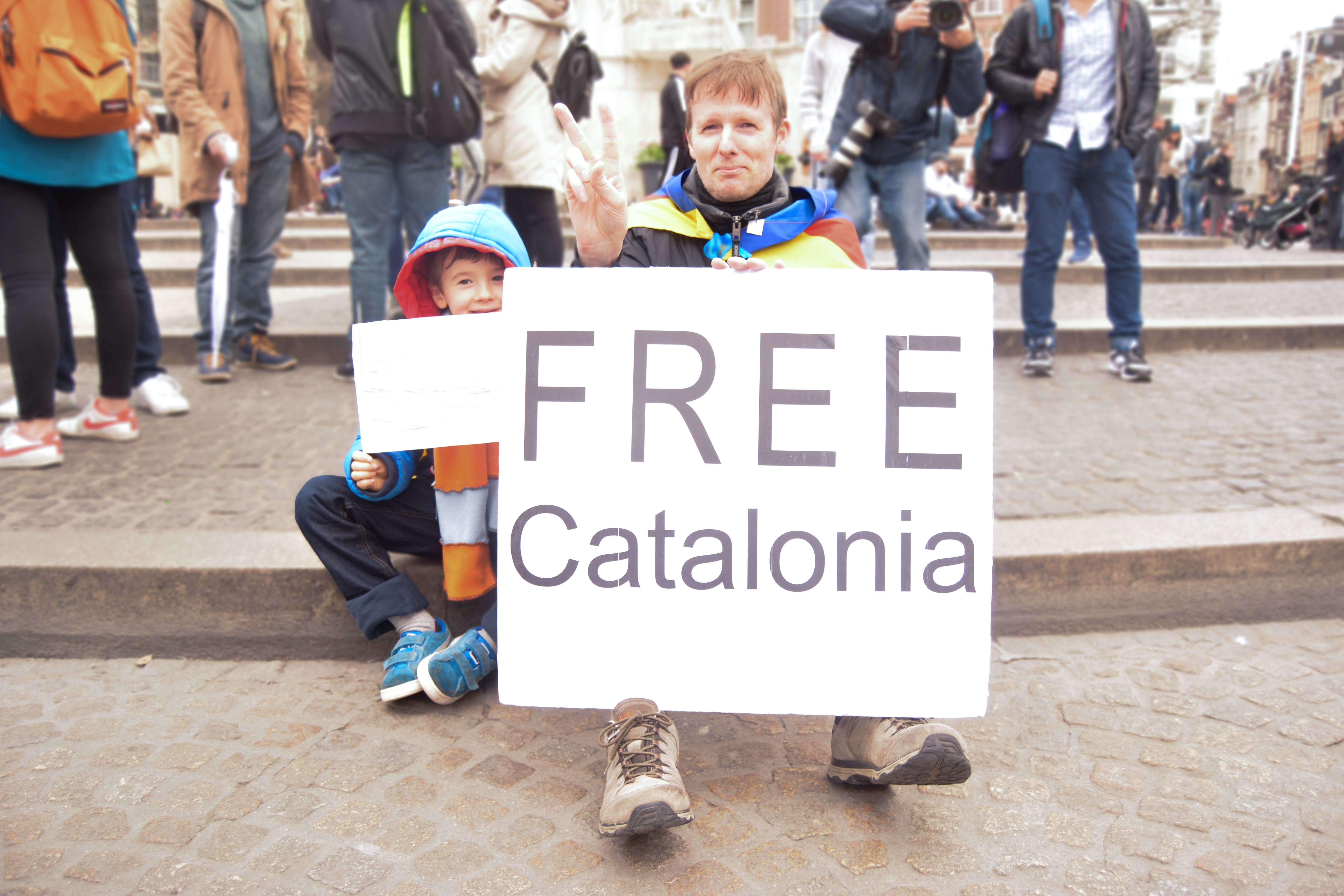 From right: Dutch 48-year-old Walter and his 6-year-old son carry a sign that reads “Free Catalonia” to show support to his Catalan wife’s beliefs. Andrea Rossignoli / Staff Photographer