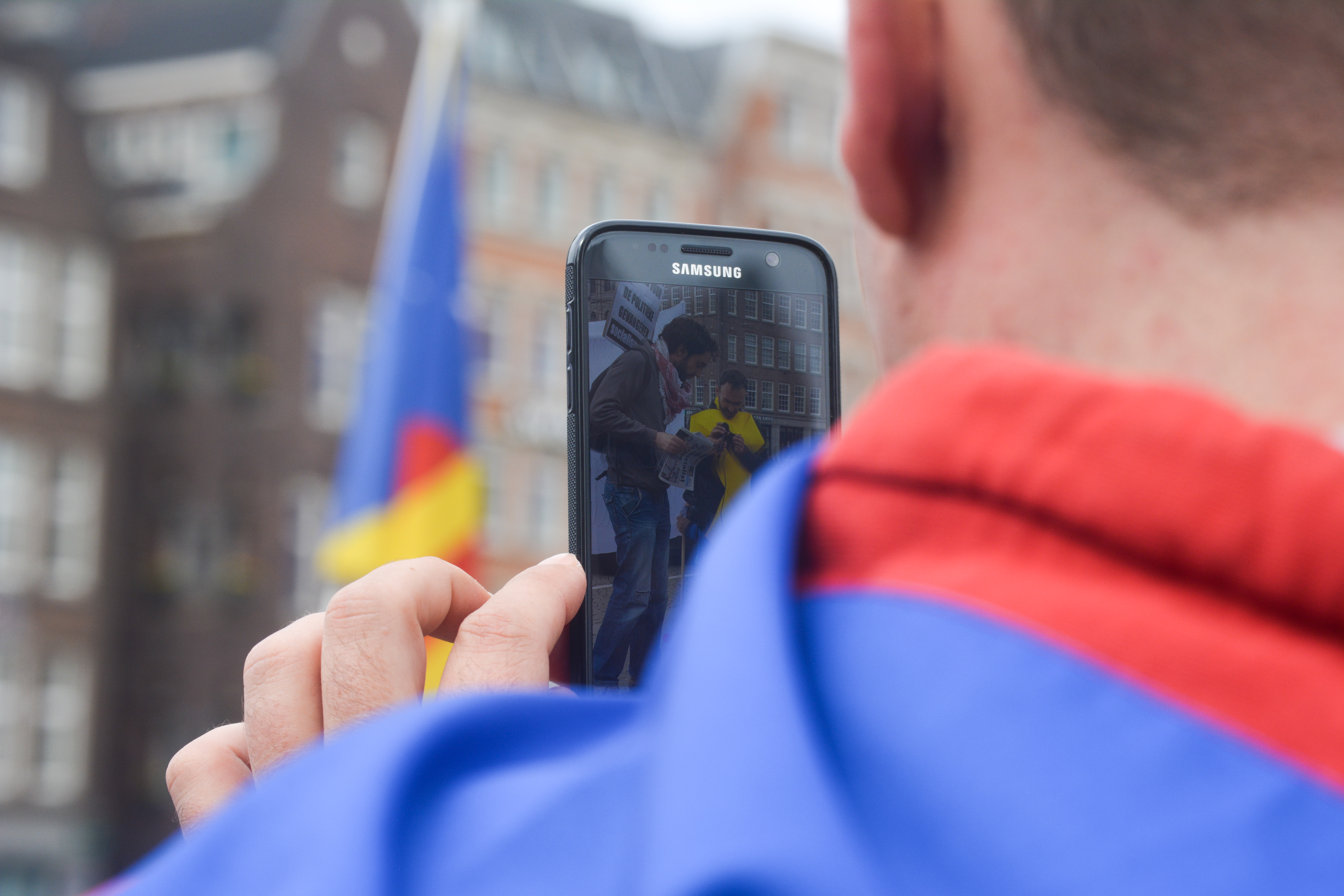 A tourist takes a picture with his smartphone to two protesters at the Dam Square on Saturday afternoon. Andrea Rossignoli / Staff Photographer