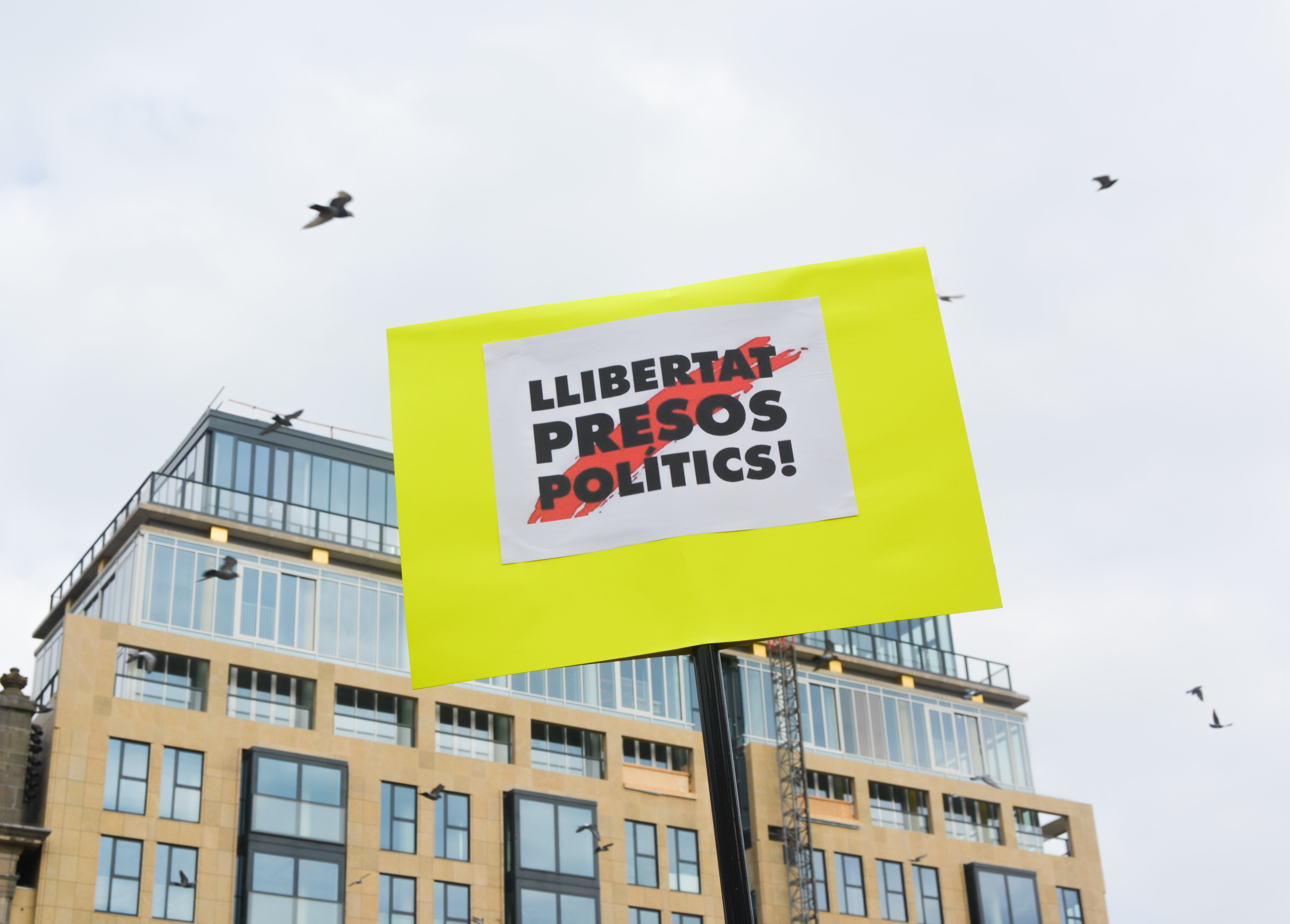 A sign reads “Llibertat presos polítics!” (Freedom for political prisoners!). A significant number of the attendees carried Catalonia’s flag wrapped around their torsos, as well as several posters that reinforced the demonstration’s purpose. Andrea Rossignoli / Staff Photographer