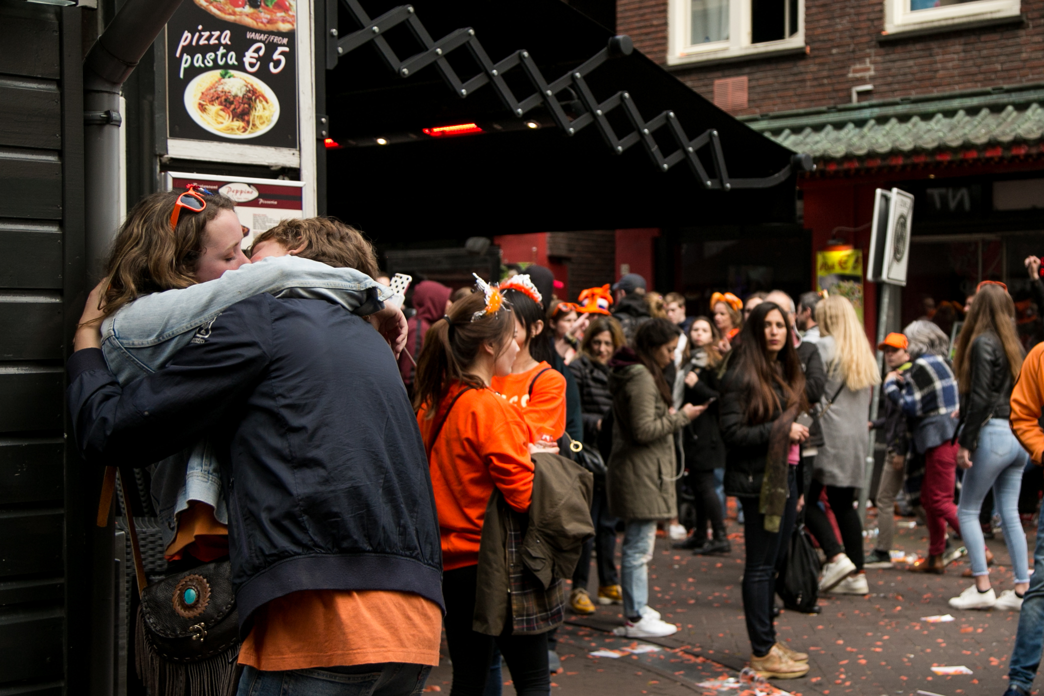 Participants of the King’s Day celebration kiss in Leidseplein, Amsterdam. Over a million people gathered on April 27 to honour Willem-Alexander’s birthday. Isabel Bonnet / Staff
